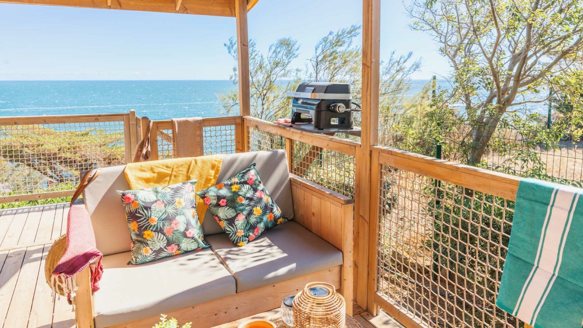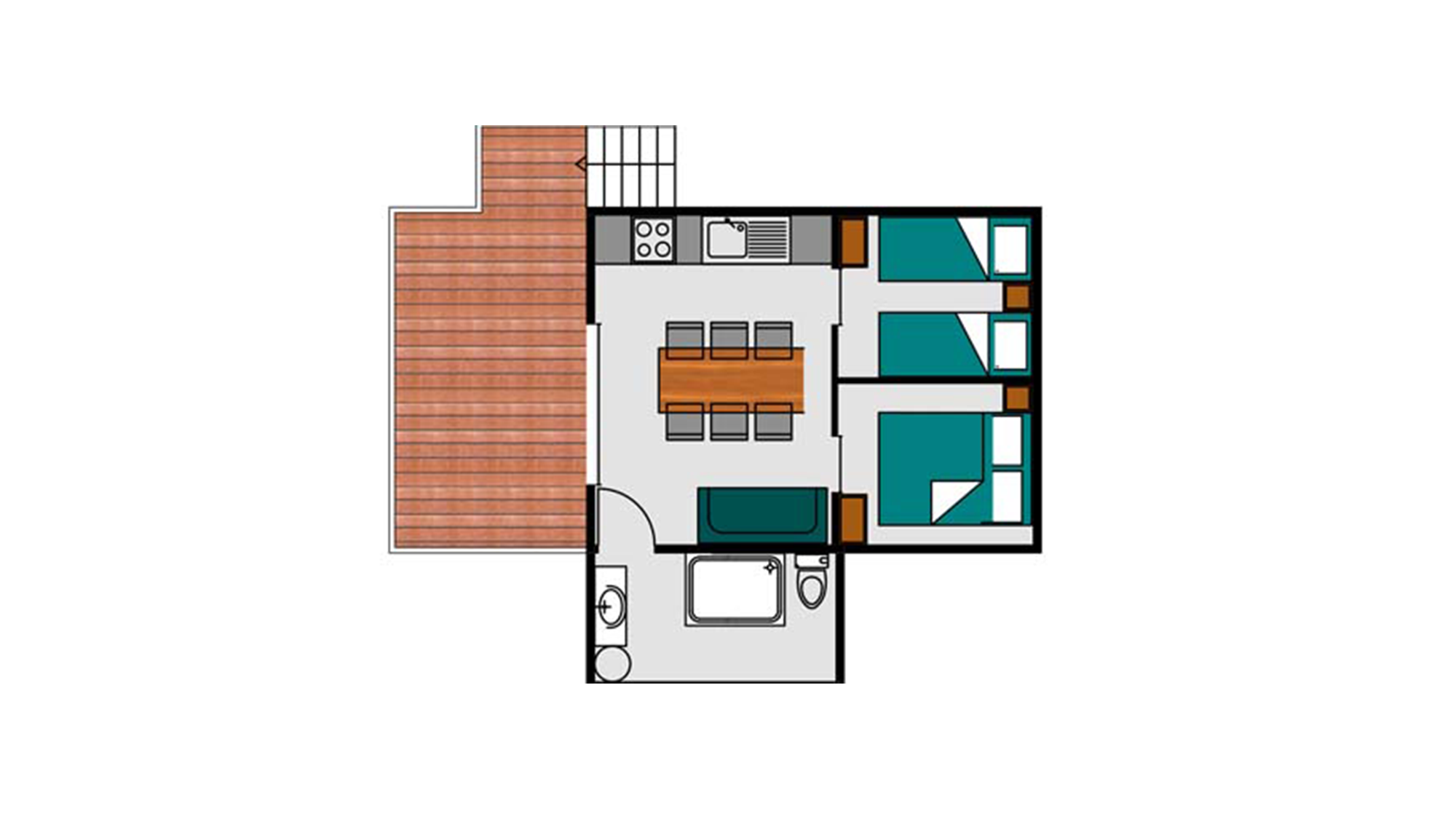 27 m² + 10 m² Overdekt terras, een slaapkamer met 1 tweepersoonsbed (140×190), een slaapkamer met twee 1-persoonsbedden (80×190), 1 slaapbank voor 2 personen (140×190). Compleet ingerichte keuken. Een badkamer met wasbak, douche en WC. Houten tuinset.