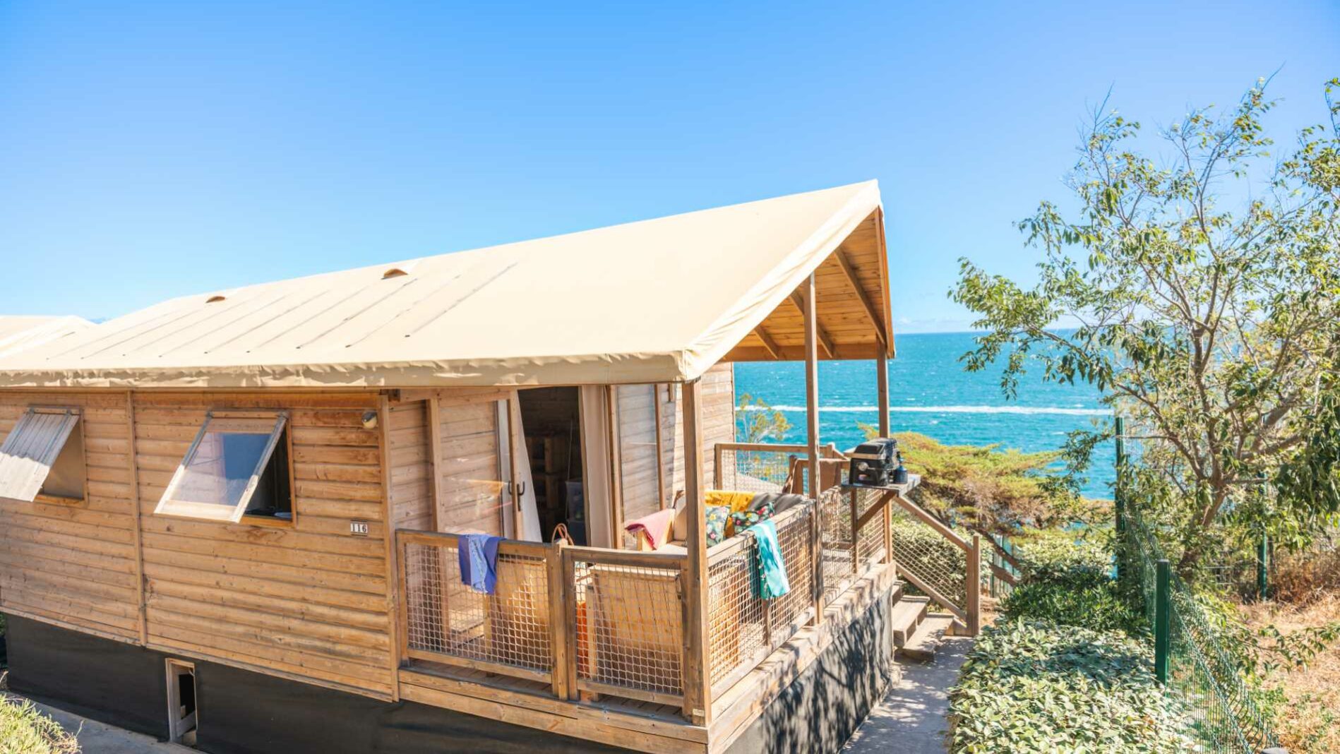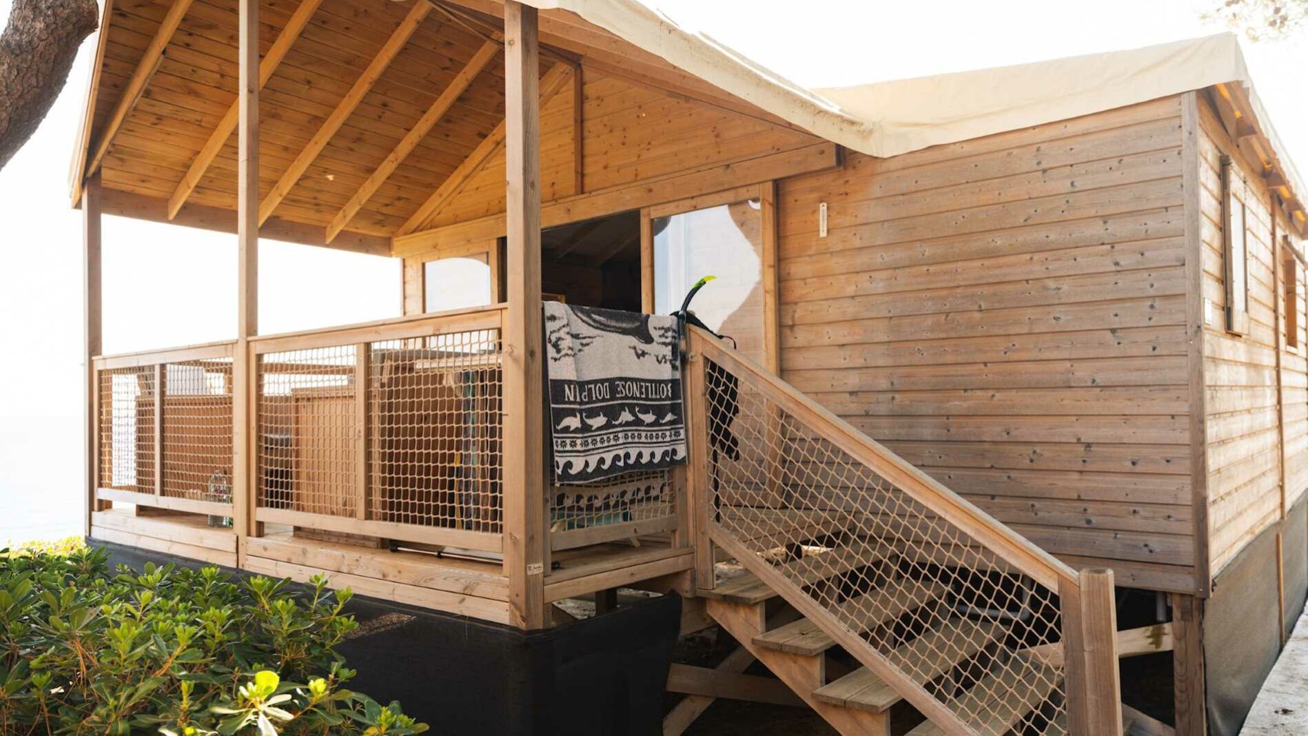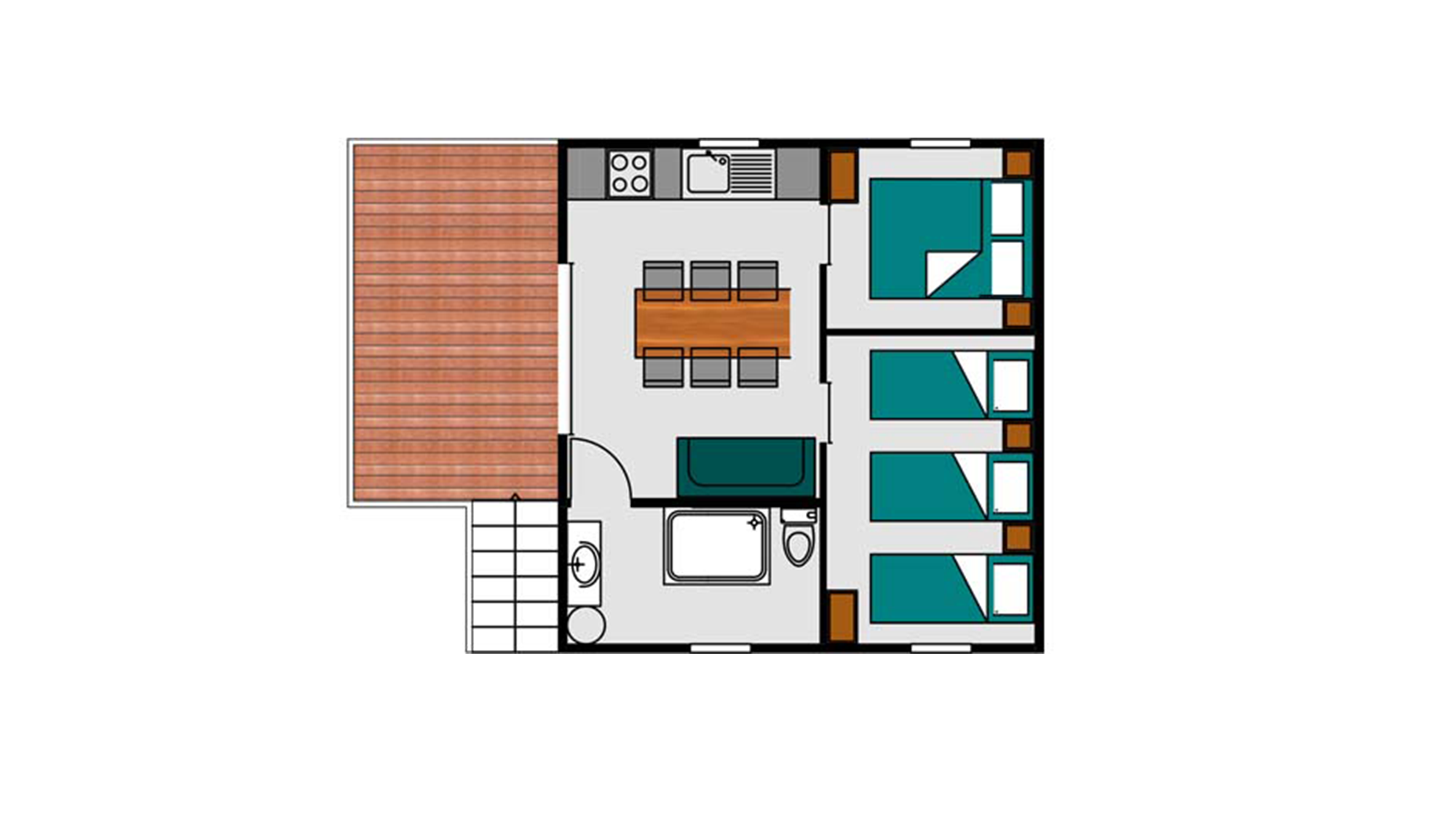32 m² + 10 m² Overdekt terras, een slaapkamer met 1 tweepersoonsbed (140×190), een slaapkamer met 3 eenpersoonsbedden (80×190), een zithoek met slaapbank voor 2 personen (140×190). Compleet ingerichte keuken. Een badkamer met wasbak, douche en wc. Houten tuinset.