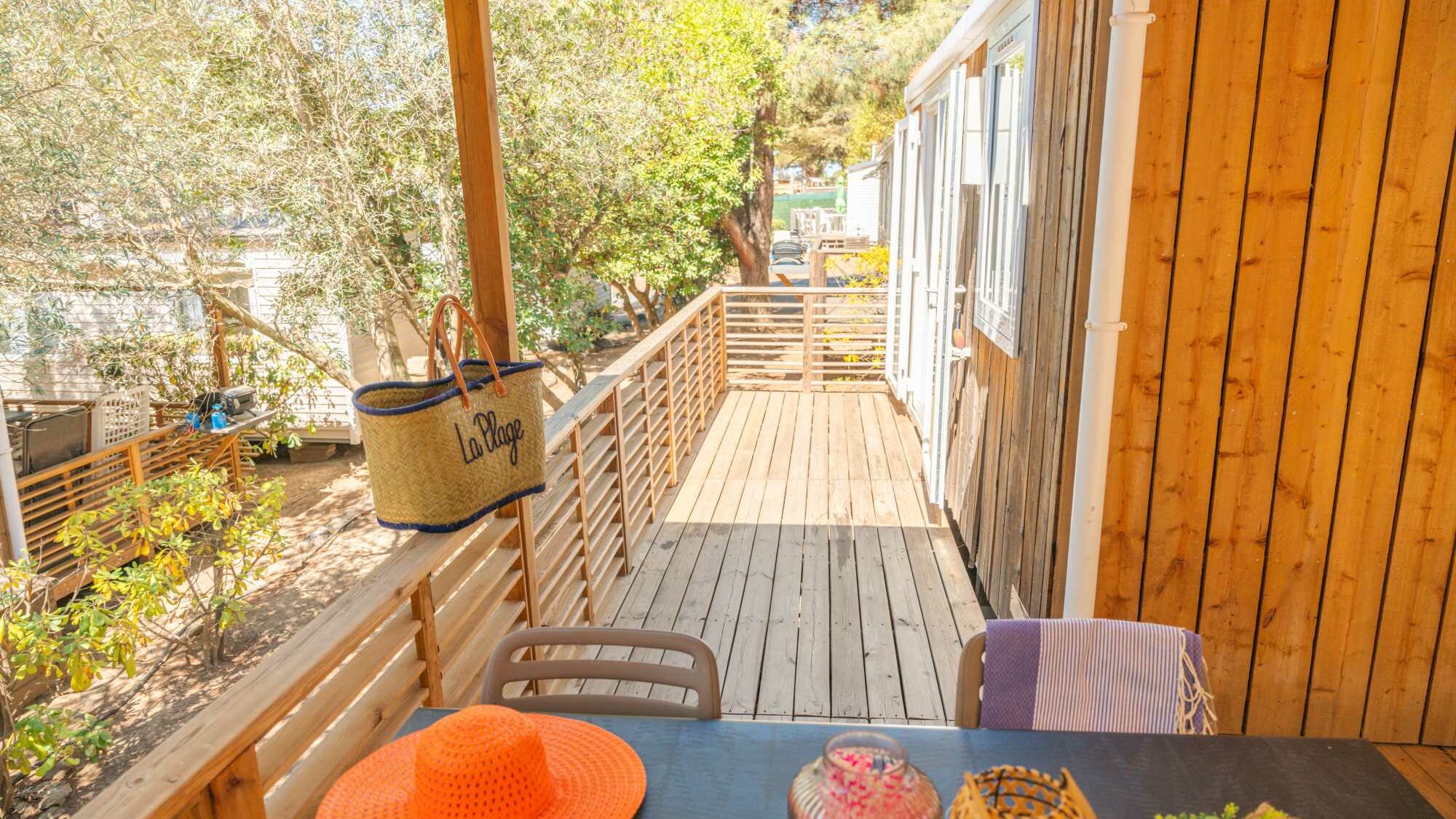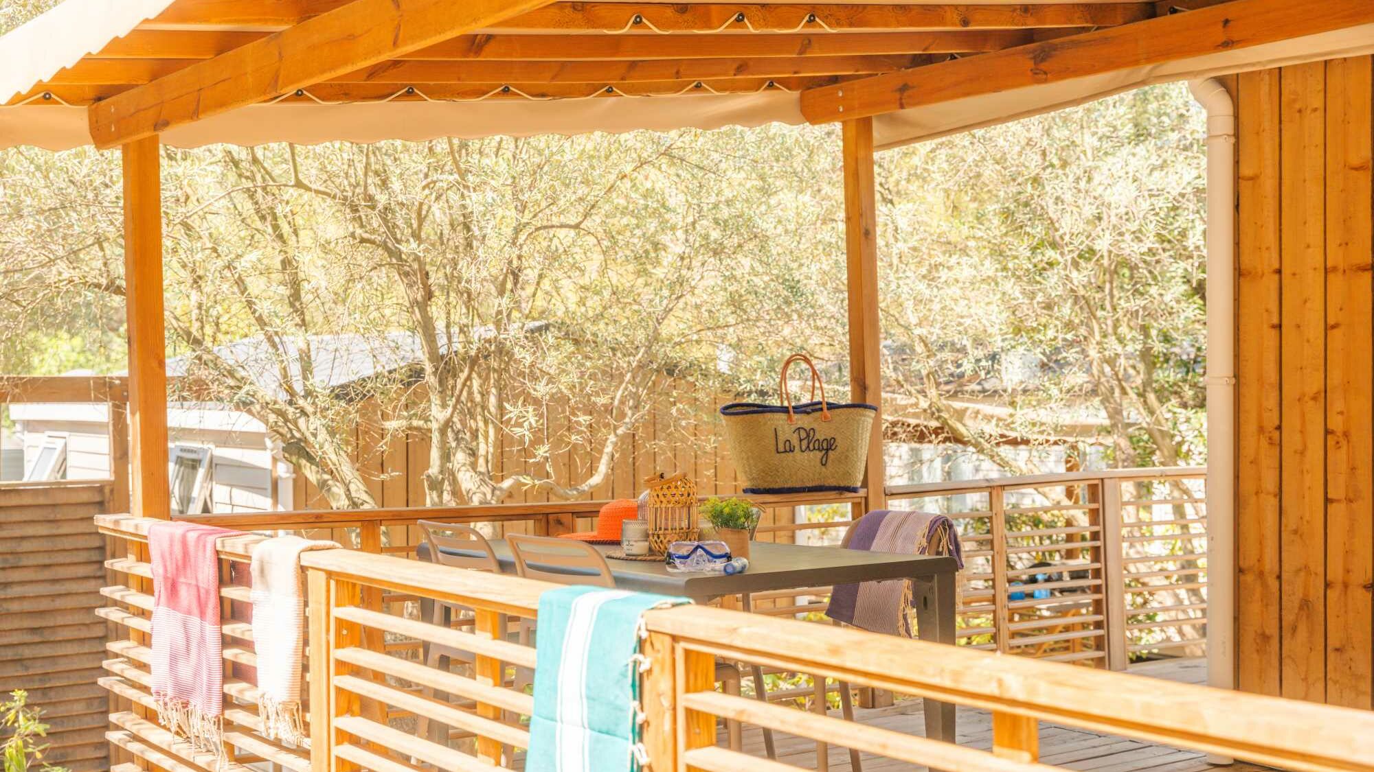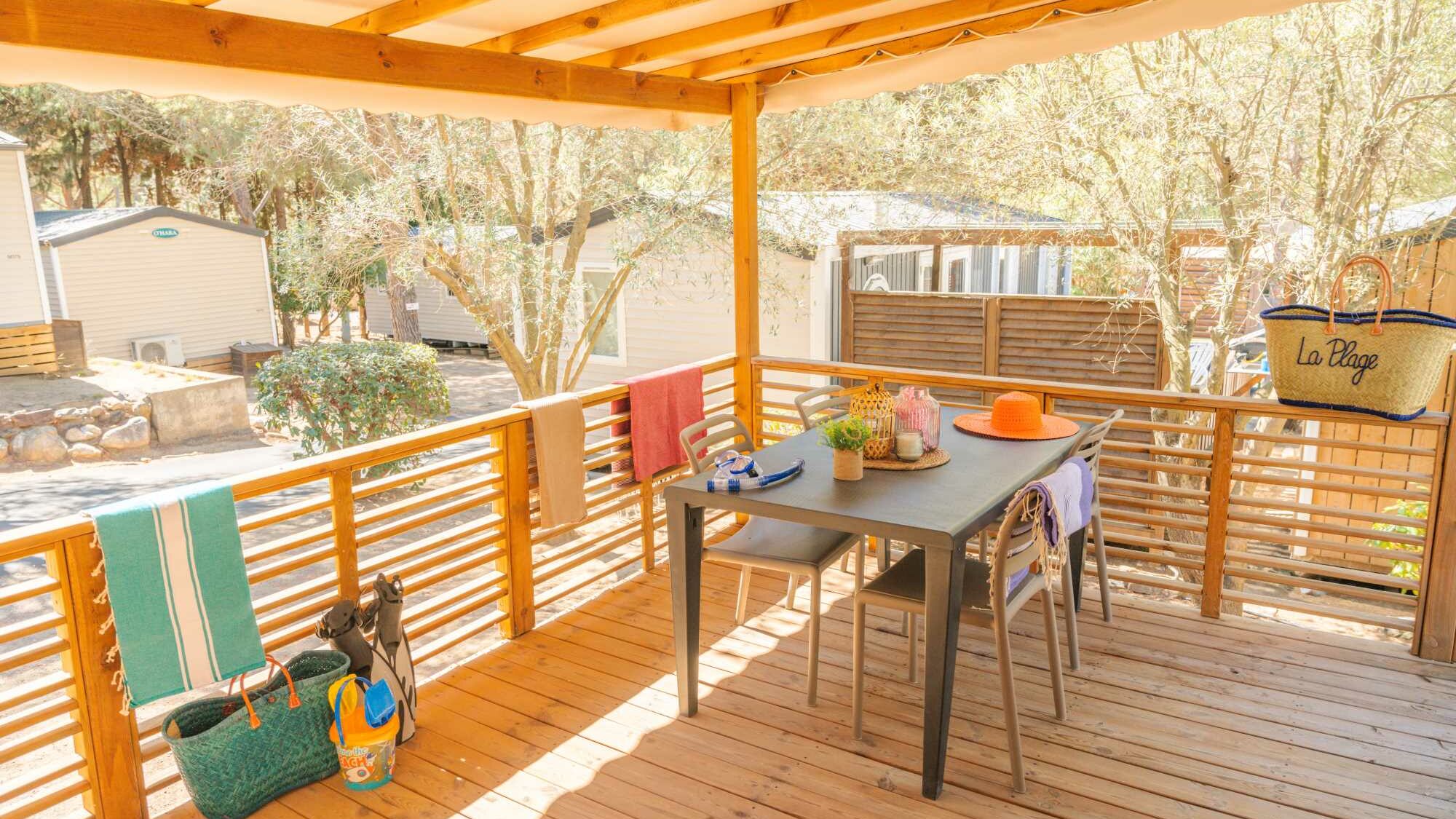 20m² +15m² Overdekt terras, een slaapkamer met een tweepersoonsbed (160 x 200) een zithoek om te bouwen tot een tweepersoonsbed (130 x 190), een volledig ingerichte keuken, een badkamer met douche, wasbak en wc. Tuinset.