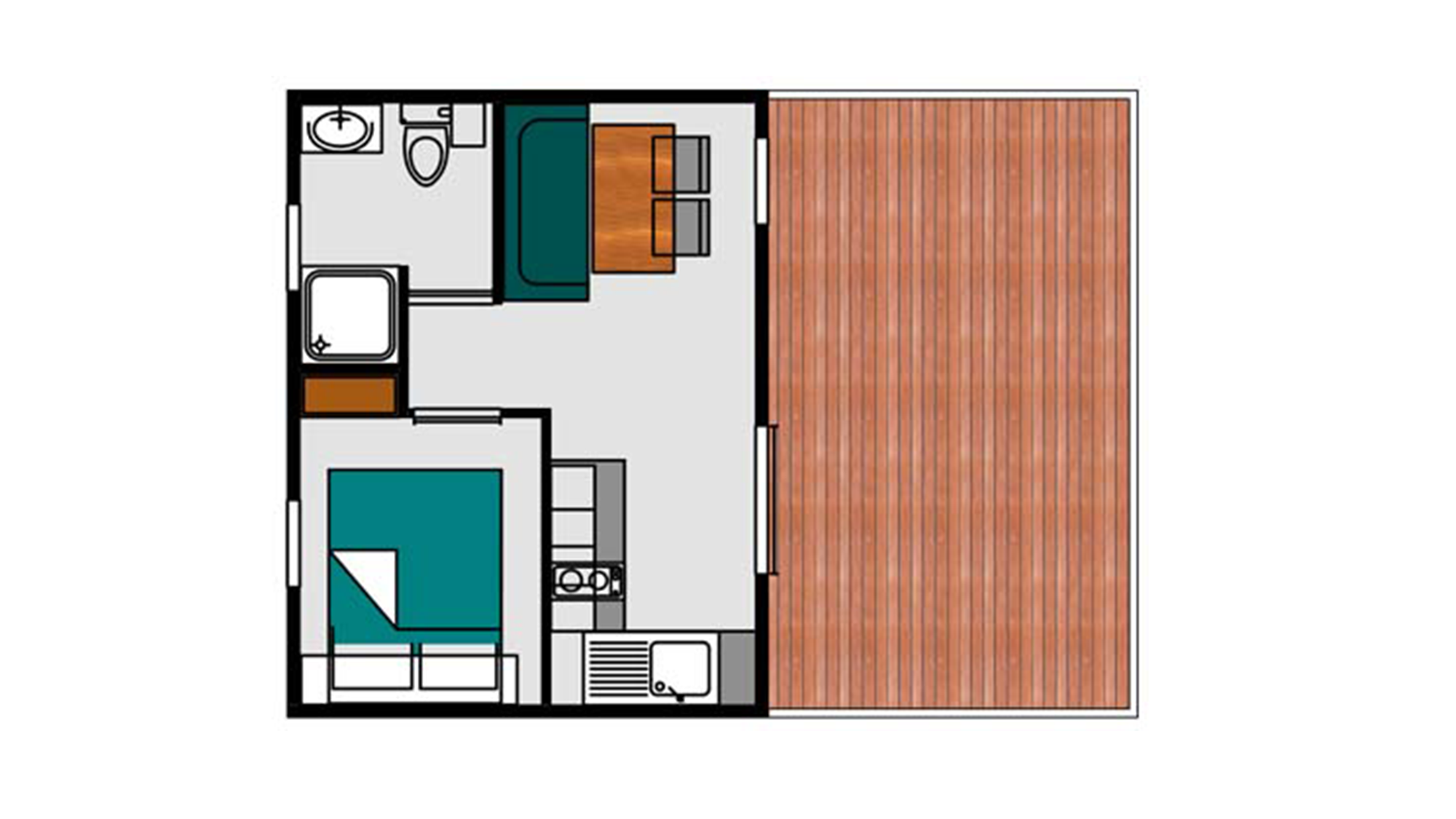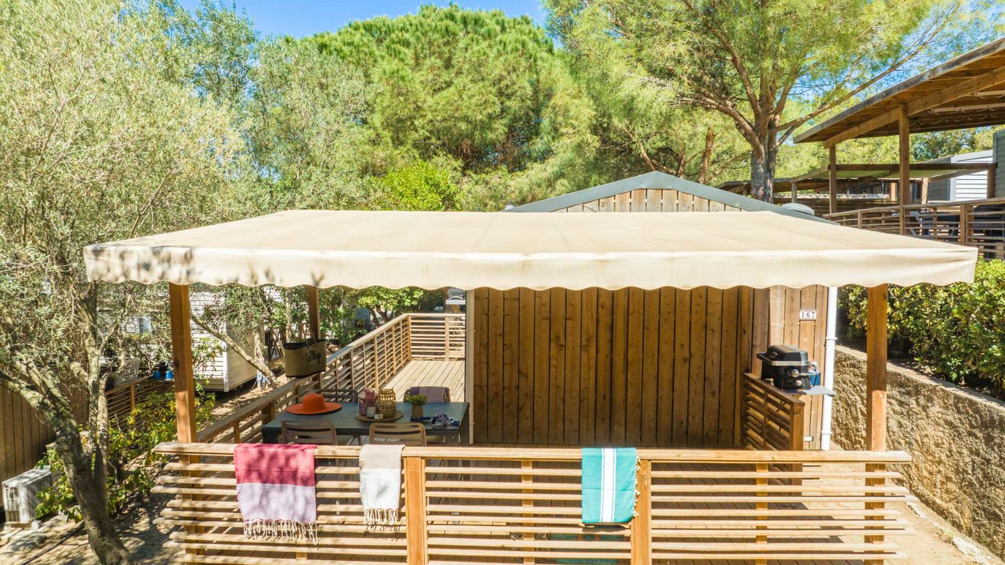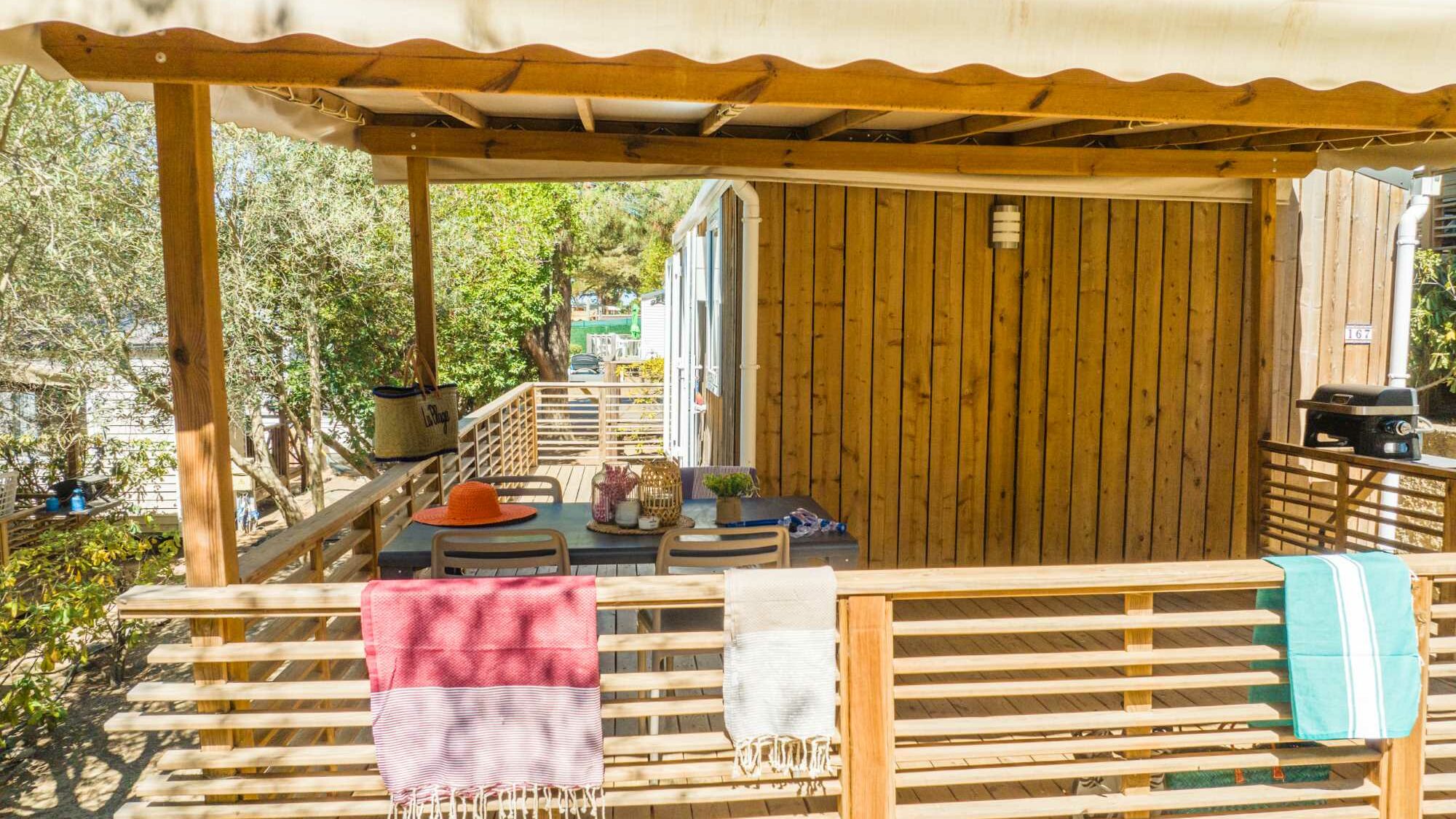 20m² +15m² Overdekt terras, een slaapkamer met een tweepersoonsbed (160 x 200) een zithoek om te bouwen tot een tweepersoonsbed (130 x 190), een volledig ingerichte keuken, een badkamer met douche, wasbak en wc. Tuinset.