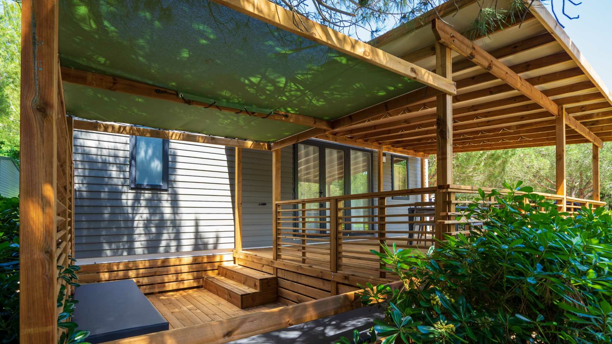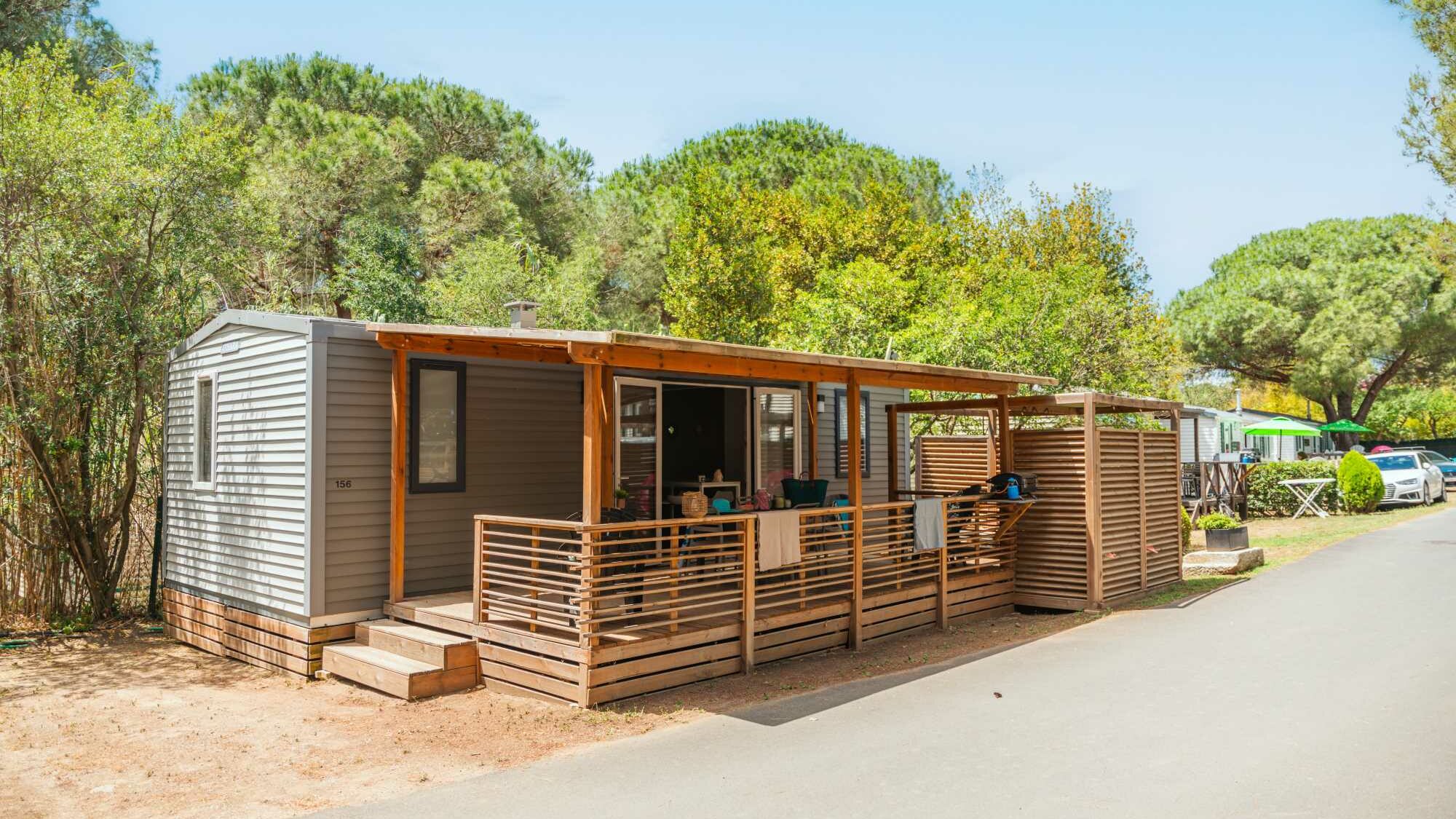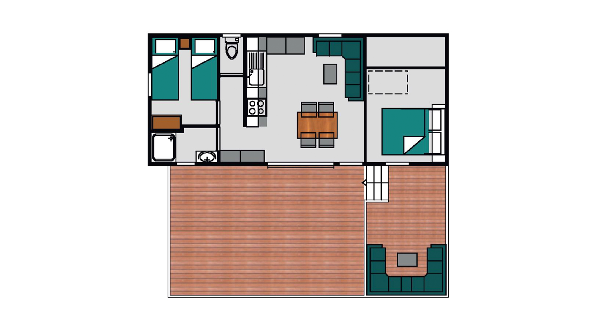 36m² + 30m² Houten terras op 2 niveaus, gedeeltelijk overdekt. Een slaapkamer met 1 tweepersoonsbed (160 x 200), een slaapkamer met 2 eenpersoonsbedden (80×190), een zithoek om te bouwen tot een tweepersoonsbed (130 x 190), een volledig ingerichte keuken, een badkamer met een wasbak, douche en aparte wc. Tuinset en lounge tuinset.