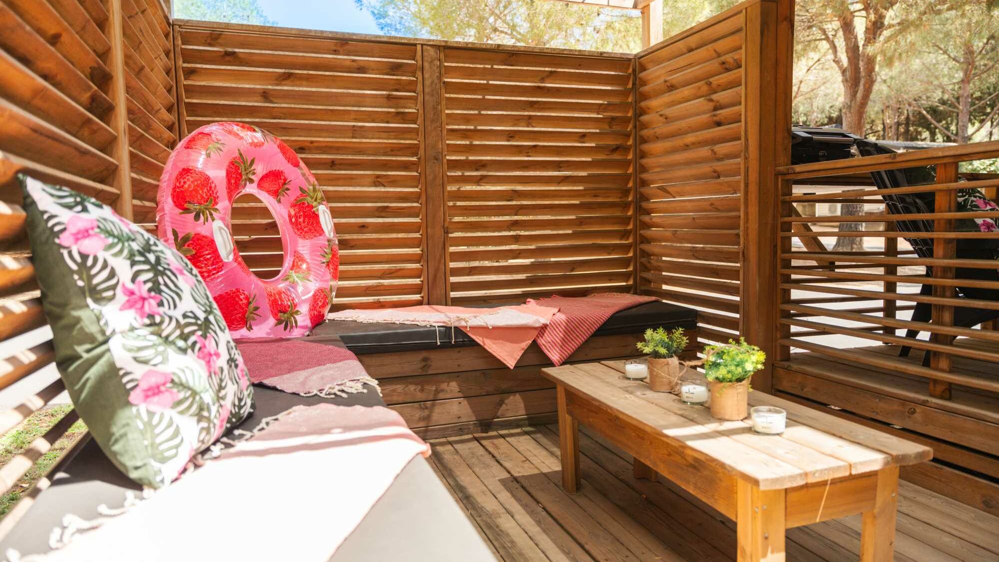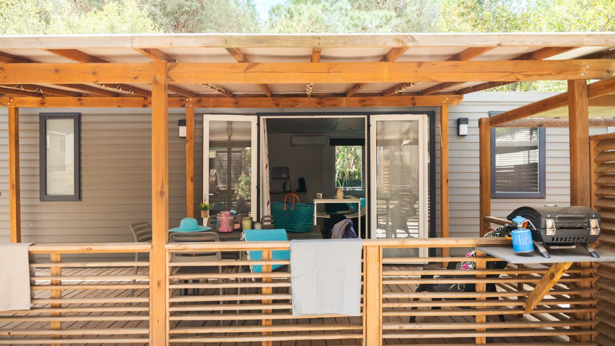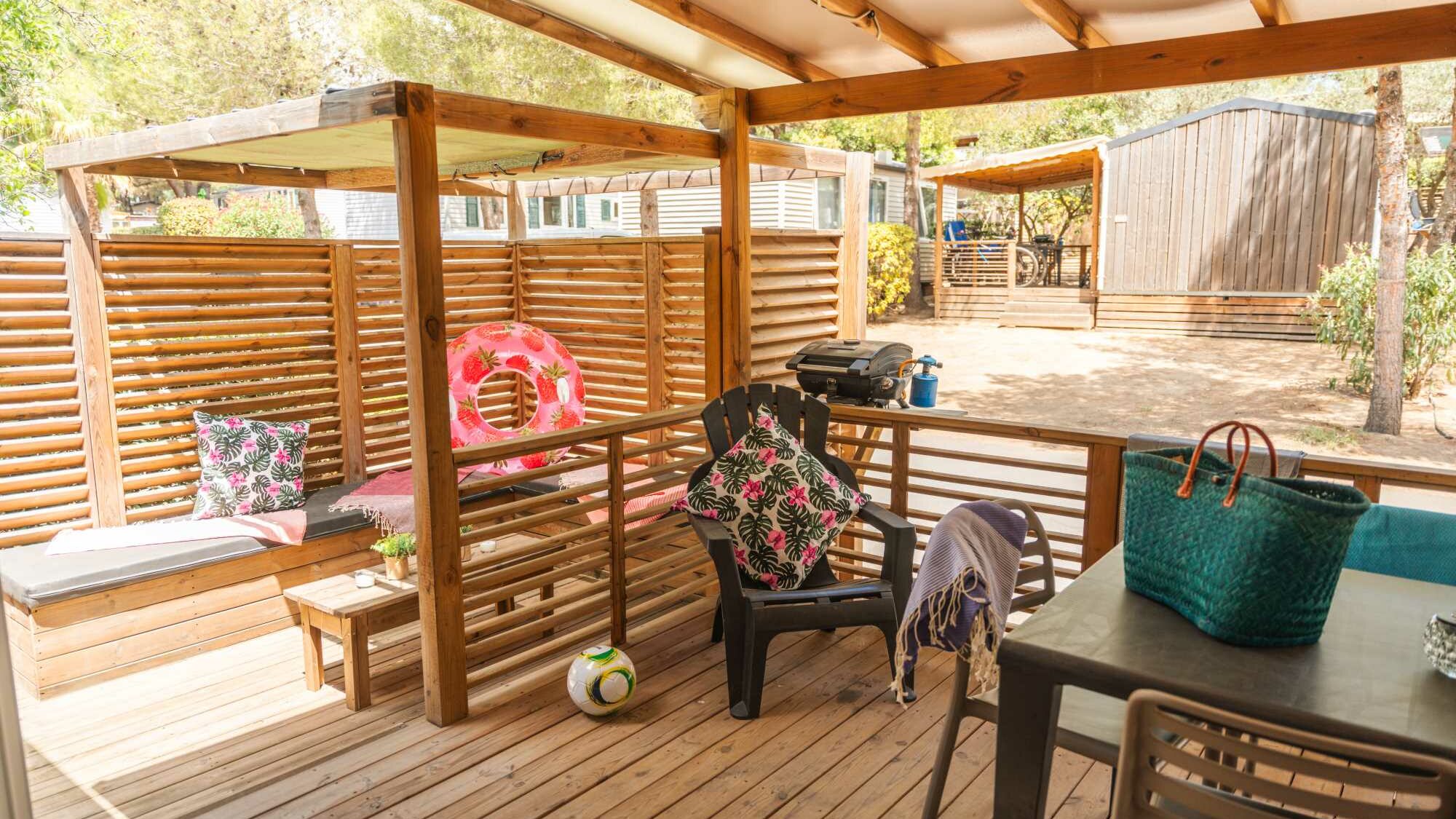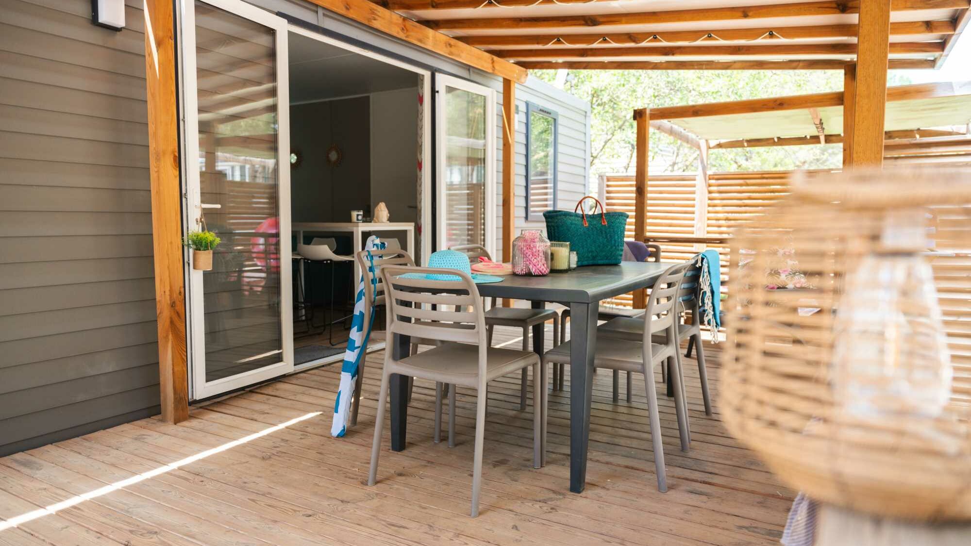 36m² + 30m² Houten terras op 2 niveaus, gedeeltelijk overdekt. Een slaapkamer met 1 tweepersoonsbed (160 x 200), een slaapkamer met 2 eenpersoonsbedden (80×190), een zithoek om te bouwen tot een tweepersoonsbed (130 x 190), een volledig ingerichte keuken, een badkamer met een wasbak, douche en aparte wc. Tuinset en lounge tuinset.